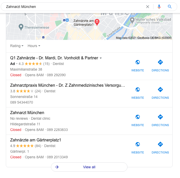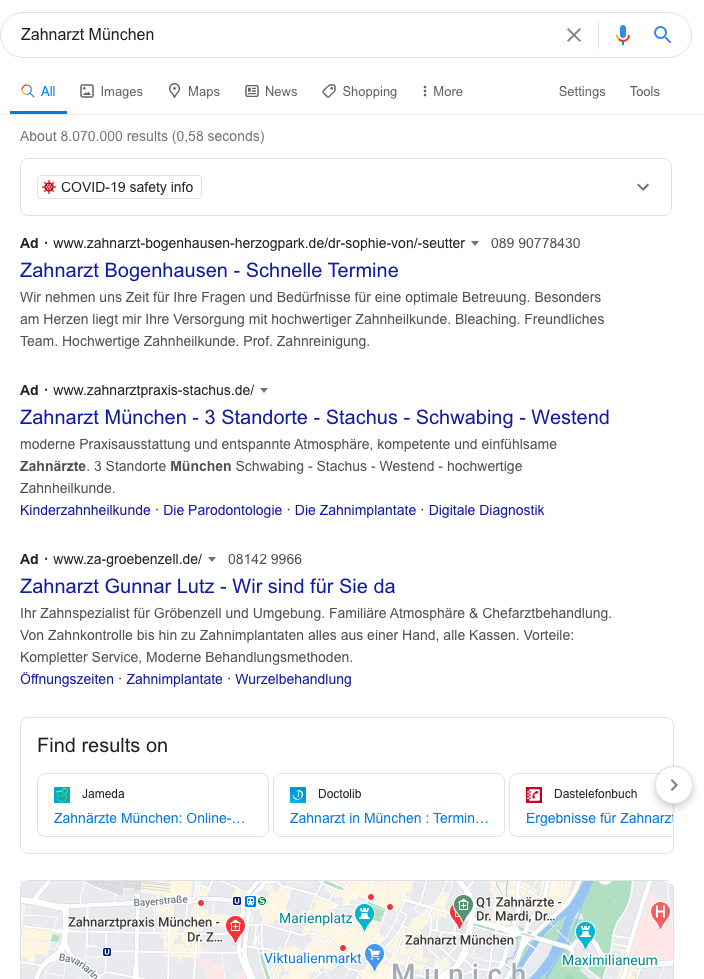 Erst bezahlte Google Ads, dann Listen-Seiten und am Ende noch eine Karte, bevor das erste richtige organische Suchergebnis angezeigt wird.